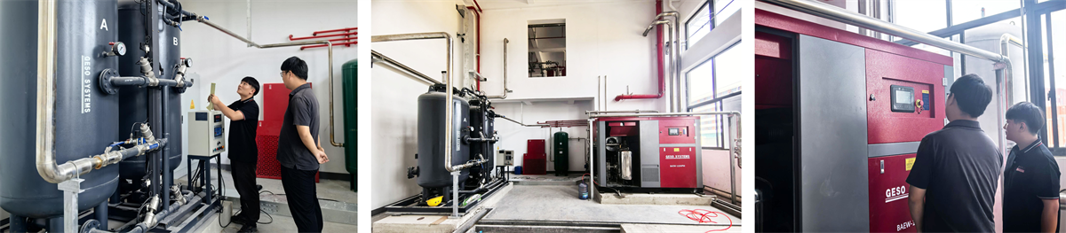 -„Geso“ be vandens suteptas oro kompresorius naudoja gryną vandenį kaip tepalą, pateikdamas 100% suspaustą orą be aliejaus, kuris atitinka ISO 8573-1 0 klasės standartą. Įrengta tikslios filtravimo sistema, ji veiksmingai pašalina didesnes kaip 0,01 μm daleles, užtikrinančias tikslaus prietaisų gamybos saugumą.